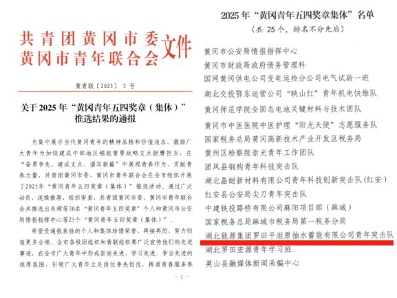平蓄公司青年突擊隊(duì)榮獲2025年黃岡市“青年五四獎(jiǎng)?wù)拢w)”