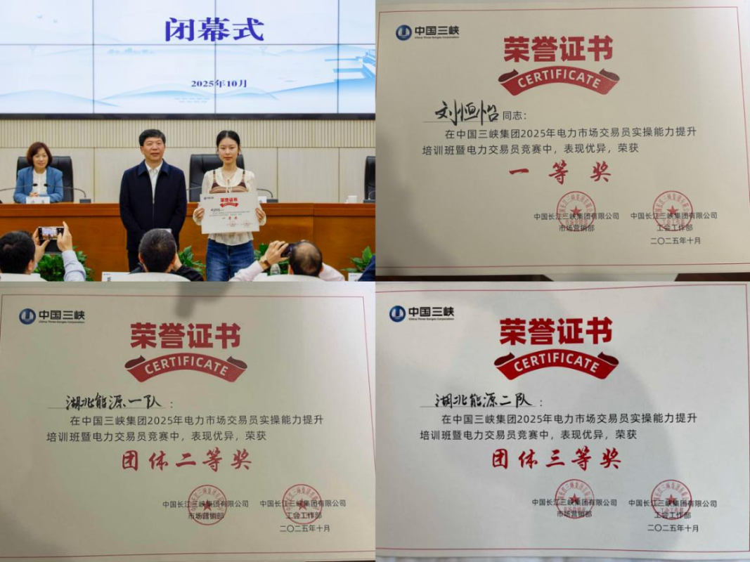 10月28日至31日,三峽集團在宜昌舉辦2025年電力市場交易員實操能力提升培訓班暨電力交易員競賽。來自長江電力、三峽能源、湖北能源等多家單位共93名選手、31支隊伍同臺競技。經過激烈角逐,新能源公司劉恒怡個人成績位列第一名,榮獲個人一等獎;湖北能源一隊(顧望、聶赟、劉恒怡)斬獲團隊二等獎,湖北能源二隊(周子天、李向龍、夏文馨)奪得團隊三等獎;售電公司夏文馨、湯光植、顧望,鄂州發電公司聶赟,襄陽宜城發電公司朱杰文,漢江能源公司周子天等6人榮獲個人優秀獎。